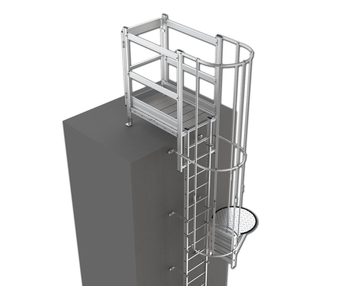 When a fixed ladder extends more than 20 feet, you are required to have a cage to meet safety requiements. It works perfectly with personal fall arrest system.